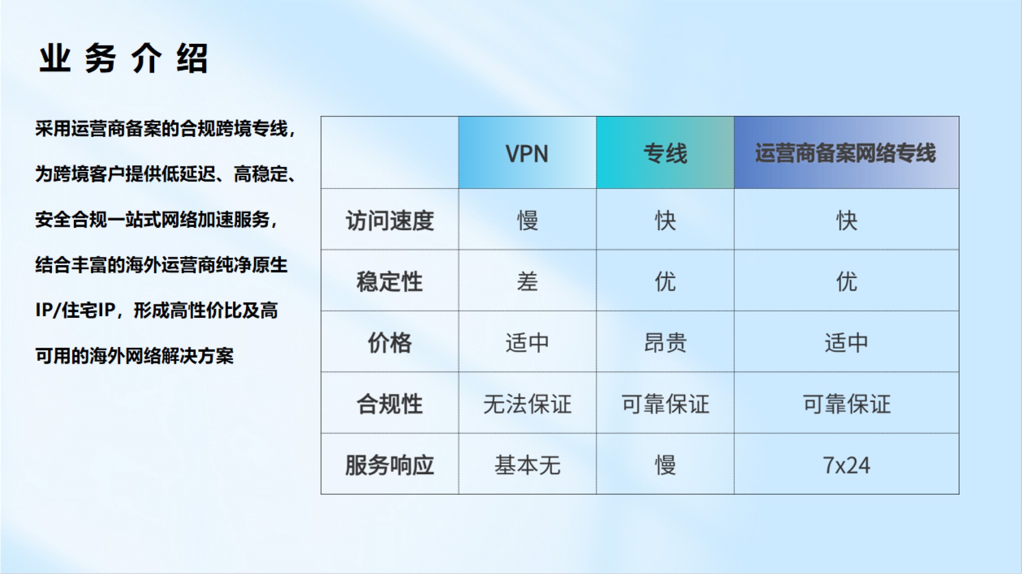 遵從運(yùn)營(yíng)商規(guī)則,采用運(yùn)營(yíng)商備案網(wǎng)絡(luò)專線,結(jié)合海外運(yùn)營(yíng)商純凈獨(dú)享原生IP,提供低延遲、高穩(wěn)定、安全合規(guī)的海外網(wǎng)絡(luò)服務(wù)